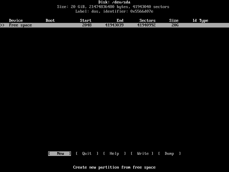 4.下一個屏幕顯示您在所選磁盤上有多少可用空間并讓您分配它。選擇屏幕底部的New并按Enter開始創(chuàng)建新的磁盤分區(qū)。