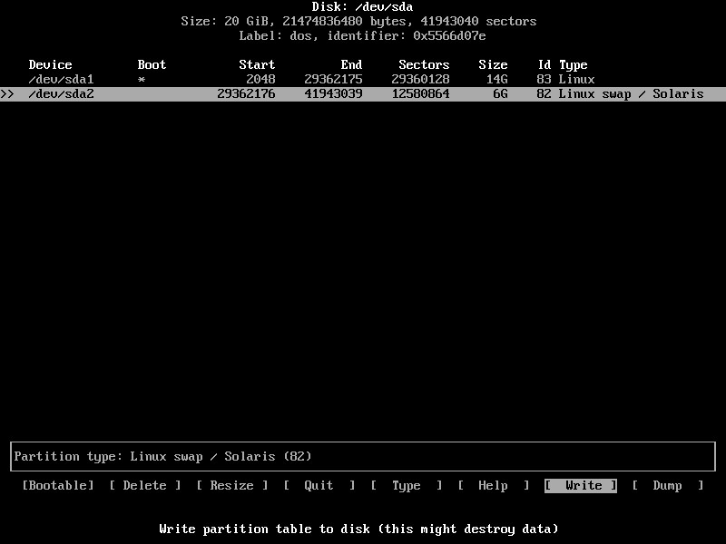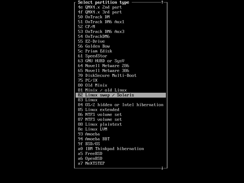 9.在列表中向下滾動,直到找到82Linux swap / Solaris。按Enter確認。這將創(chuàng)建一個交換空間分區(qū)。