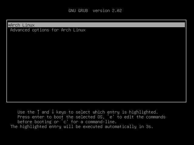 系統(tǒng)重新啟動后,GRUB 會加載并為您提供加載 Arch Linux 的選項。按Enter加載系統(tǒng)。使用您設置的密碼登錄。