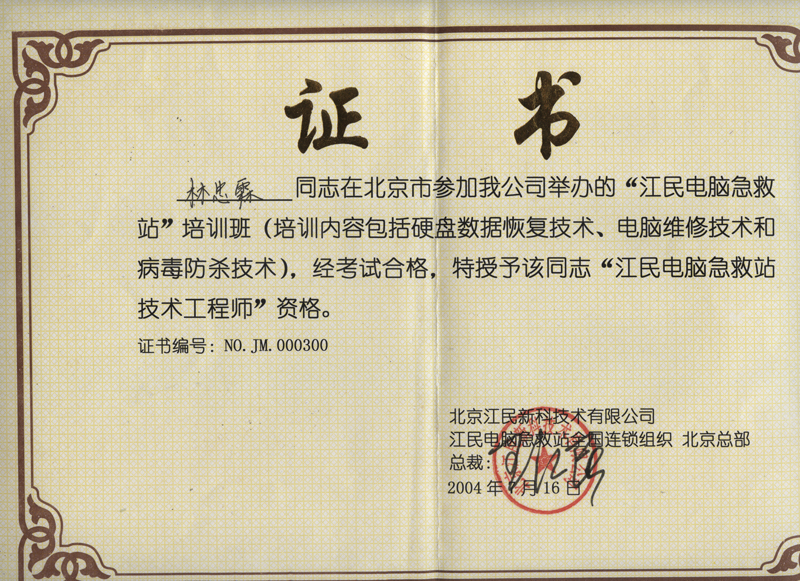 后獲得北京“江民電腦急救站技術(shù)工程師”的資格證書(數(shù)據(jù)恢復(fù)病毒防御專業(yè))、效率源國際數(shù)據(jù)恢復(fù)中心確認頒發(fā)的“數(shù)